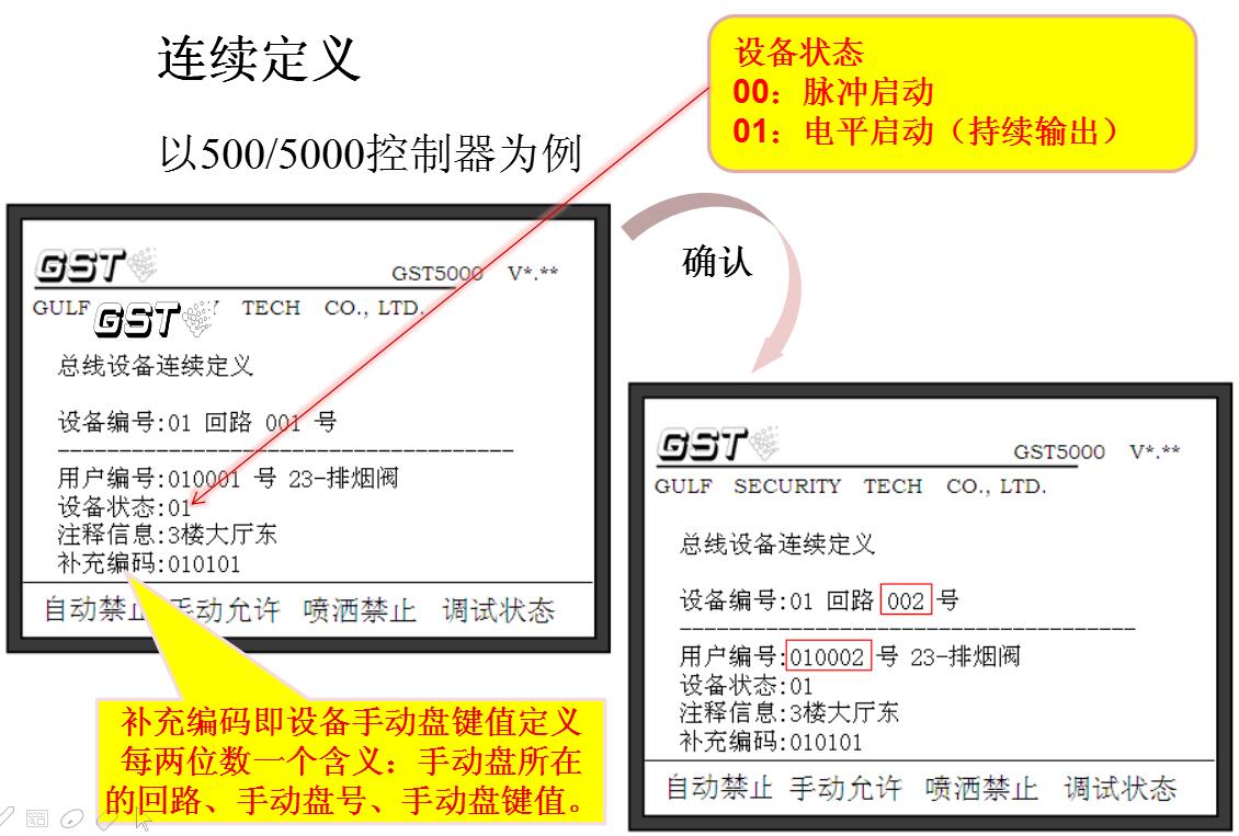 控制器所接的可編址外部設備均需進行編碼設定,每個設備對應一個原始編碼(一次碼,如下圖紅色數字)和一個用戶編碼(二次碼,如下圖藍色+綠色數字構成完整的二次碼),設備定義就是對用戶編碼進行設定。被定義的設備既可以是已經注冊在控制器上的,也可以是未注冊在控制器上的。