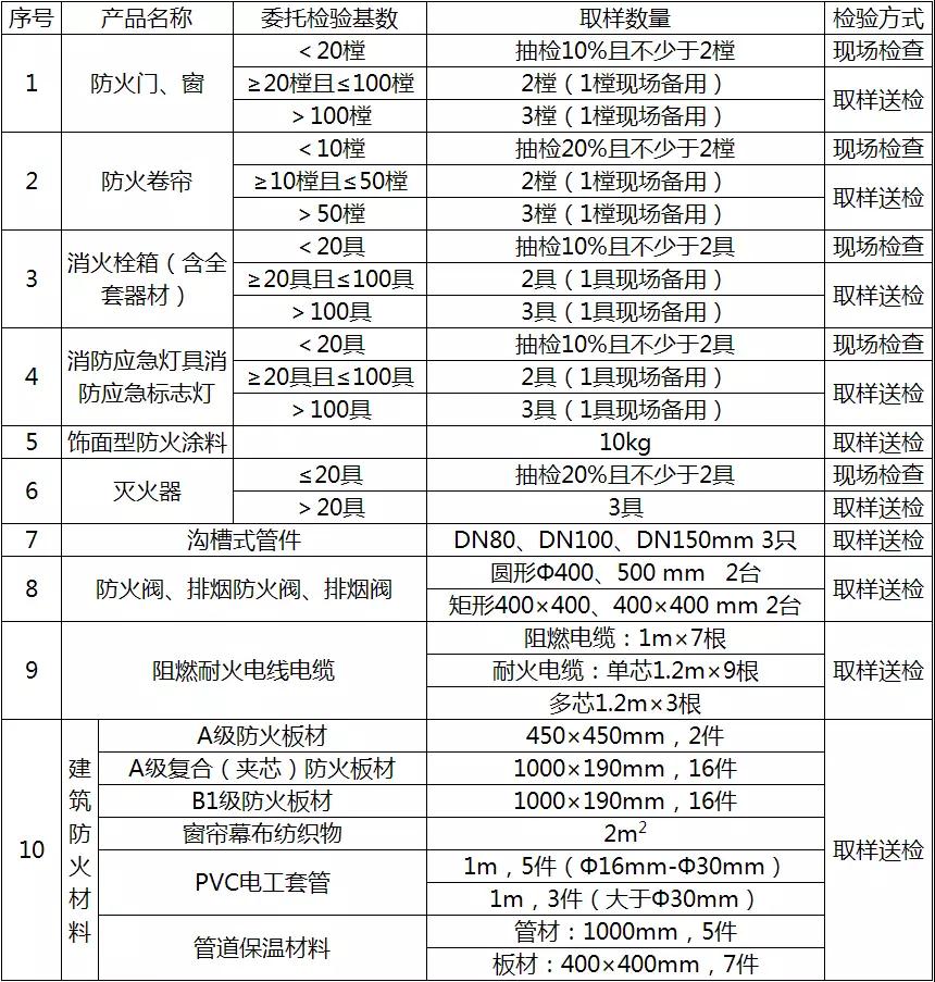 工程建設領域選用消防產品委托檢驗基數及取樣數量列表