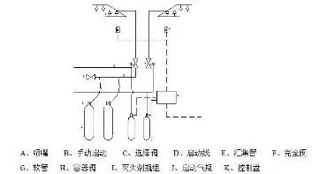 本系統(tǒng)的主要設(shè)備和器材包括:?jiǎn)?dòng)氣瓶、啟動(dòng)氣瓶、滅火劑瓶組、控制器、選擇閥、安全閥、容器閥、噴嘴等。