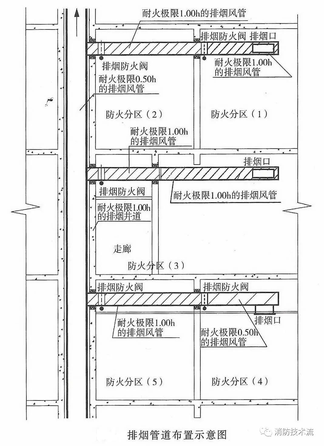4 設置在走道部位吊頂內的排煙管道,以及穿越防火分區的排煙管道,其管道的耐火極限不應小于1.00h,但設備用房和汽車庫的排煙管道耐火極限可不低于0.50h。