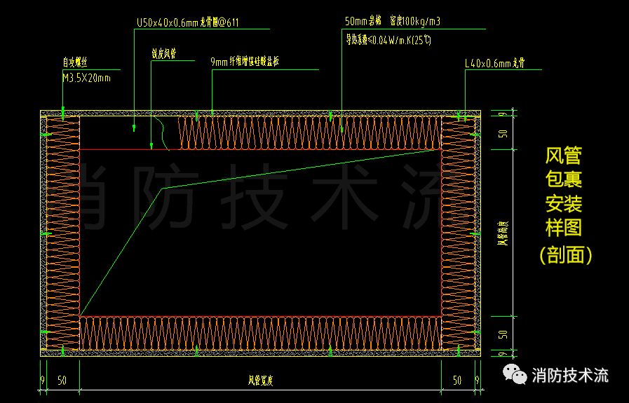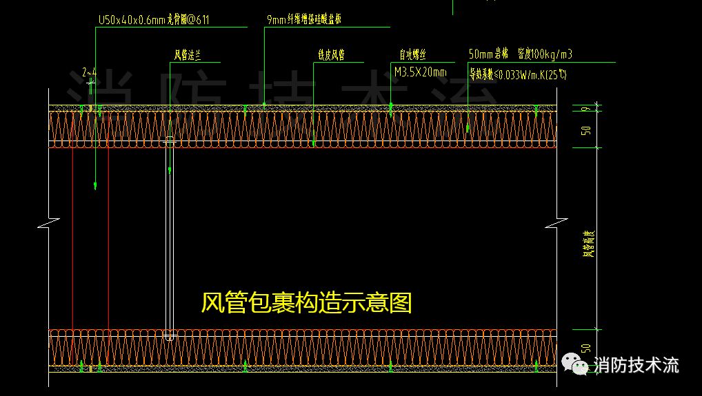 3、耐火極限不小于1h的風管(如不在吊頂內水平設置的加壓風管、內走道及非機動車庫排煙管),外表面作防火包裹處理。包裹材料:9mm纖維增強硅酸鹽防火板+50mm巖棉