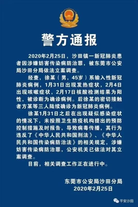日前,東莞市沙田首例確診患者徐某,發病后未及時報告,導致與其密切接觸的方某等3人確診,涉嫌防害傳染病防治罪被立案調查。