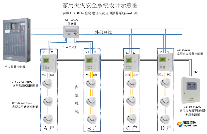 GB50016-2014《建筑設(shè)計(jì)防火規(guī)范》自2015年5月1日起實(shí)施,明確>54M住宅宜套內(nèi)安裝探測(cè)報(bào)警,>100MM住宅應(yīng)安裝探測(cè)報(bào)警。GST家用火災(zāi)安全系統(tǒng)為滿足該標(biāo)準(zhǔn)對(duì)住宅消防報(bào)警要求而設(shè)計(jì)。GST家用火災(zāi)安全系統(tǒng)中家用火災(zāi)報(bào)警控制器由GST-DY-JA2200家用火災(zāi)報(bào)警控制器專用電源箱提供DC24V電源,采用用內(nèi)部總線與家用火災(zāi)探測(cè)器通訊,接收探測(cè)器上傳的火警和故障信息。能夠預(yù)存兩組用戶電話號(hào)碼,當(dāng)家用火災(zāi)報(bào)警控制器收到探測(cè)器上傳的火警信息后,立即發(fā)出聲光報(bào)警信號(hào)并顯示相應(yīng)火警信息,同時(shí)自動(dòng)撥打預(yù)存號(hào)碼,并發(fā)出語(yǔ)音或短信報(bào)警。配接了火災(zāi)報(bào)警控制器,還能夠通過外部總總線及時(shí)上傳火警或故障報(bào)警信息。