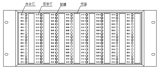 GST-LD-SD128智能手動消防啟動盤的外觀示意圖如圖2-11。每塊手動盤的每一單元均有一個按鍵、兩只指示燈和一個標(biāo)簽。其中,按鍵為啟/停控制鍵,如按下某一單元的控制鍵,則該單元的命令燈亮(紅色),并有控制命令發(fā)出,如被控設(shè)備響應(yīng),則回答燈亮(紅色)。用戶可將各按鍵所對應(yīng)的設(shè)備名稱書寫在設(shè)備標(biāo)簽上面,然后與膜片一同固定在手動盤上。
