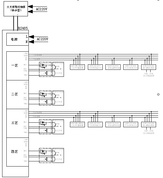 Z1、Z2:各區的總線輸出端子,連接緊急啟/停按鈕、聲光警報器、氣體噴灑指示燈、輸出模塊、手自動轉換開關等總線設備。