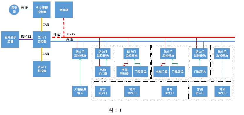注:本圖僅作為防火門監(jiān)控系統(tǒng)組成的示意圖,不同監(jiān)控器的端口、DC24V 配置不同,具體請參考各產(chǎn)品的主要技術(shù)指標(biāo)部分。