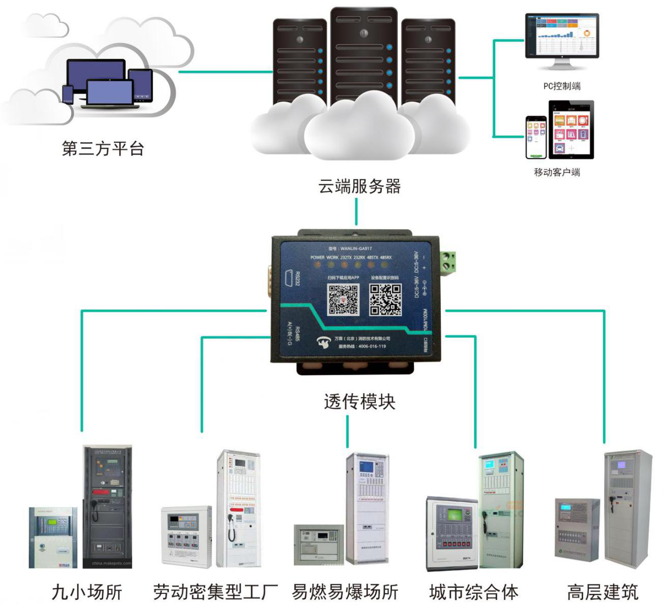 以上問題通過智慧消防解決,應用現代互聯網路由器等技術實現,無需穿管做線等施工,只需要采用傳統消防主機+傳輸GA917傳輸模塊,數據傳輸采用232/485等通訊協議,采用intent網線數據傳輸(或4G),設備供電采用消防主機供電,無需備用電源也不用單獨拉線,只需要有網線即可,設備唯一MAC地址識別性,安裝海灣公安APP,可以通過手機APP進行參數設置,將消防主機數據實時進行遠程傳輸。海灣公安APP的賬號可以登錄客戶端集中管理平臺(智慧消防網絡CRT云平臺系統),將30個消防主機報警信息通過這個CRT云平臺管理,該平臺支持多個用戶管理(甲方、施工方、維保單位、消防支隊等),每個消防報警主機的點位都可以通過該平臺實時監測火警、故障等報警信息。