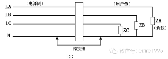 原理是:這種情況下,零線電流矢量的模大于LA、LB、LC 的電流矢量和的模。剩余電流矢量的模近似等于零線電流矢量的模與LA、LB、LC 的電流矢量和的模之差。當(dāng)跨接線把零線電流分流后,流過互感器鐵芯磁路的零線電流減小了,于是探測器顯示的剩余電流便減小。