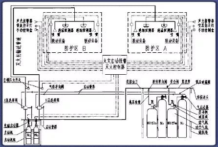 該系統(tǒng)由滅火劑瓶組、加壓氣體瓶組、驅(qū)動(dòng)氣體瓶組(可選)、單向閥、選擇閥、減壓裝置、驅(qū)動(dòng)裝置、集流管、連接管、噴頭、信號(hào)反饋裝置、安全泄放裝置、控制盤、檢漏裝置、管道管件及吊鉤支架等組成。