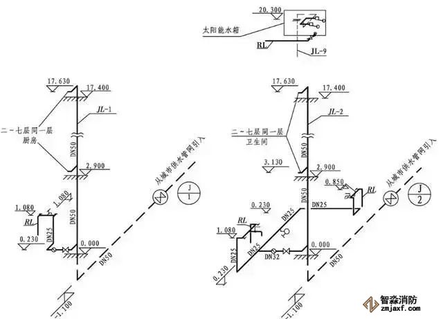 室內給排水工程的詳圖包括節點圖、大樣圖、標準圖,主要是管道節點、水表、消火栓、水加熱器、開水爐、衛生器具、套管、排水設備、管道支架等的安裝圖及衛生間大樣圖等。