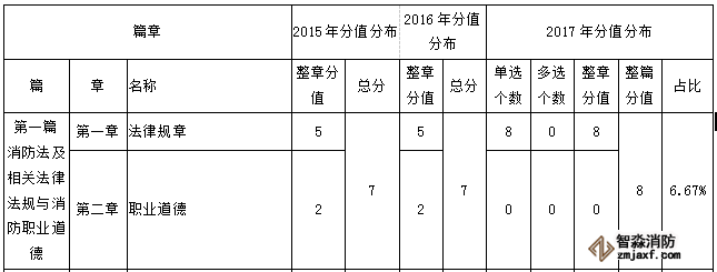 2017年一消綜合能力考試,第一篇所占分值為8分,每個章節(jié)所占分值發(fā)生了變化,第二章未出相關(guān)考點,而第一章法律規(guī)章所占分值為8分。