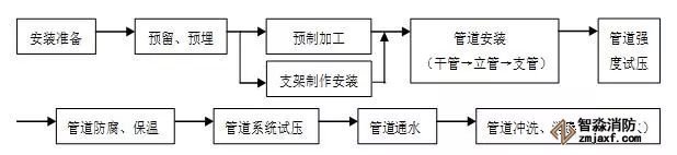 干管安裝:位于樓板下及頂層的干管,應在結構封頂后安裝;立管安裝必須在確定準確的地面標高后進行;支管安裝必須在墻面抹灰后進行。