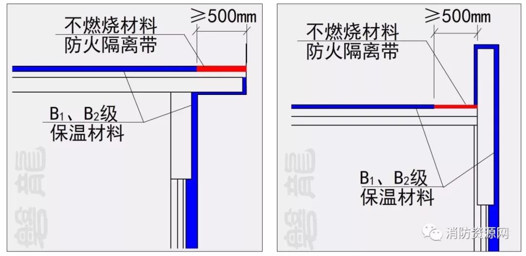 三、建筑的屋面和外墻外保溫系統(tǒng)均采用B1、B2級(jí)保溫材料時(shí),屋面與外墻之間應(yīng)采用寬度不小于500mm的不燃材料設(shè)置防火隔離帶進(jìn)行分隔。