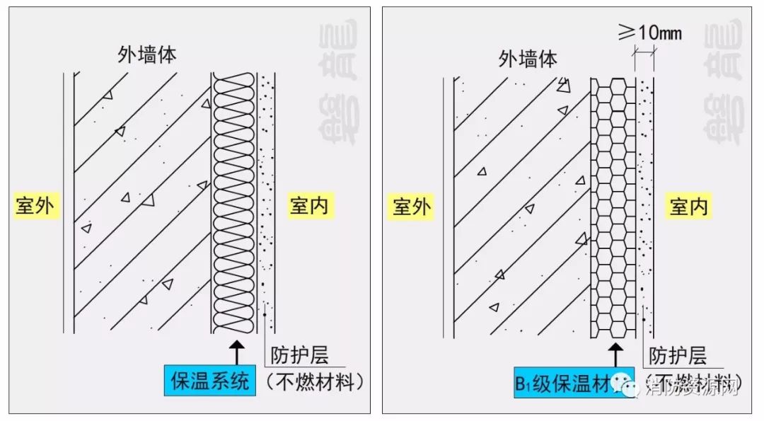 2.1、建筑外墻的內(nèi)保溫系統(tǒng),保溫材料設(shè)置在建筑外墻的室內(nèi)側(cè),保溫系統(tǒng)應(yīng)采用不燃材料做防護(hù)層。當(dāng)采用燃燒性能為B1級(jí)的保溫材料時(shí),防護(hù)層的厚度不應(yīng)小于10mm。
