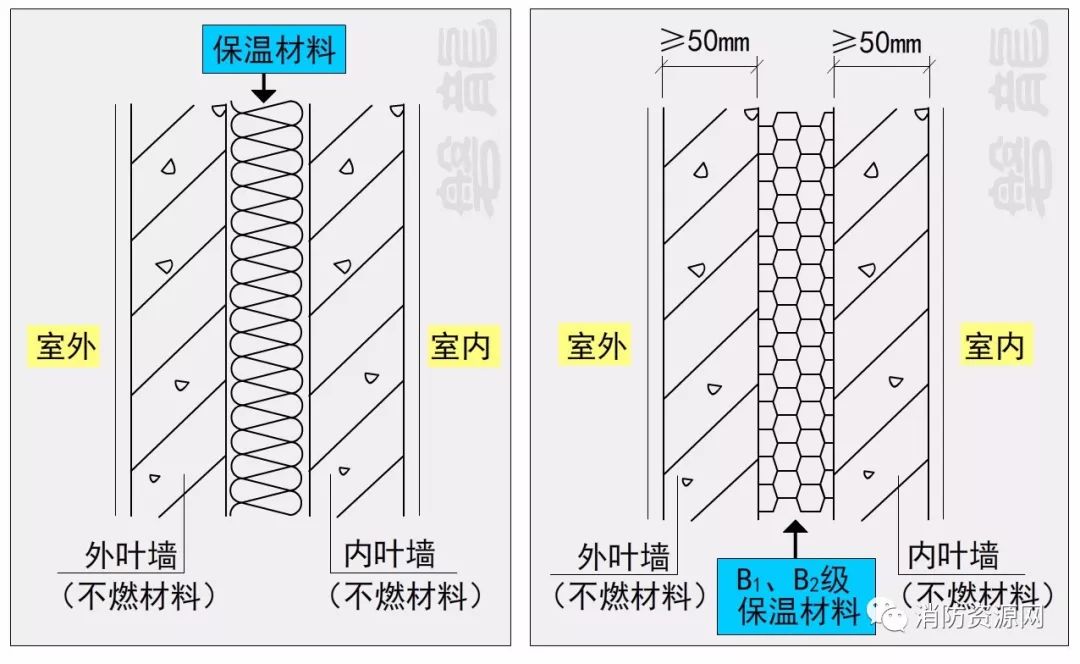 當(dāng)保溫材料的燃燒性能為B1、B2級(jí)時(shí),保溫材料兩側(cè)的不燃材料墻體厚度均不應(yīng)小于50mm