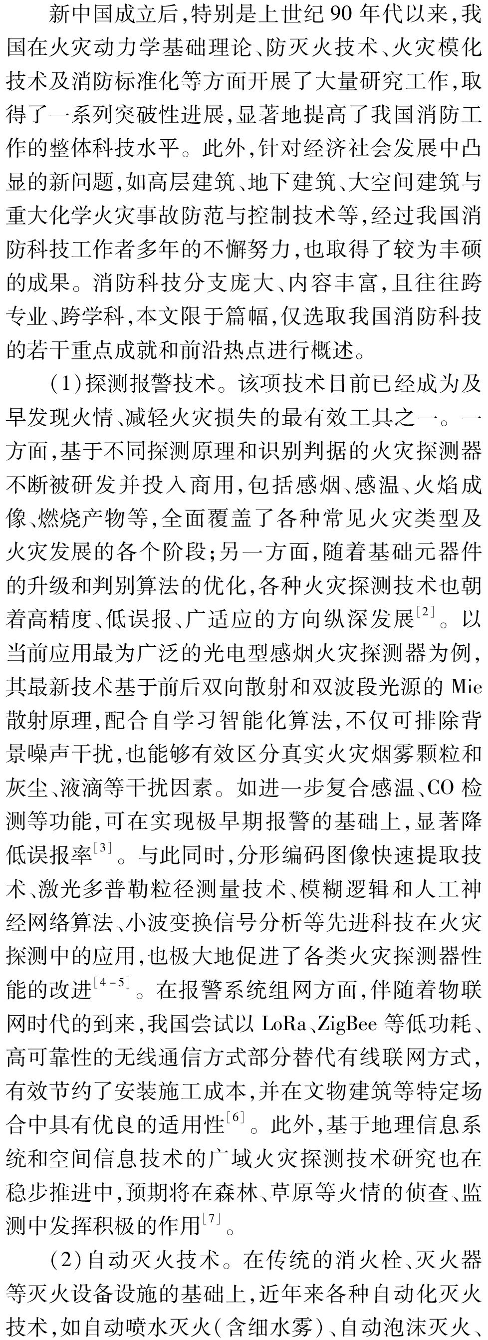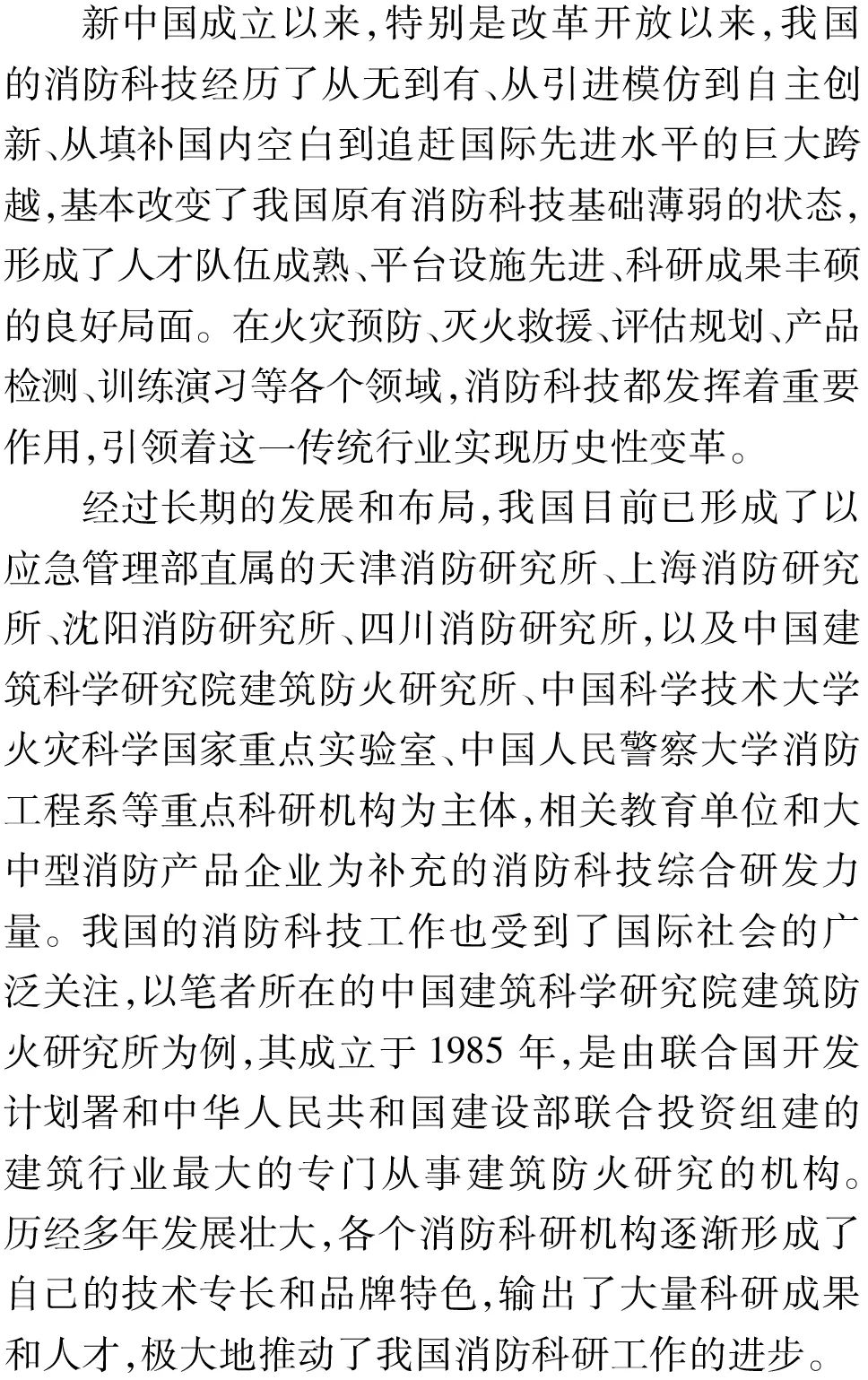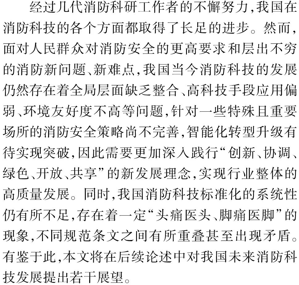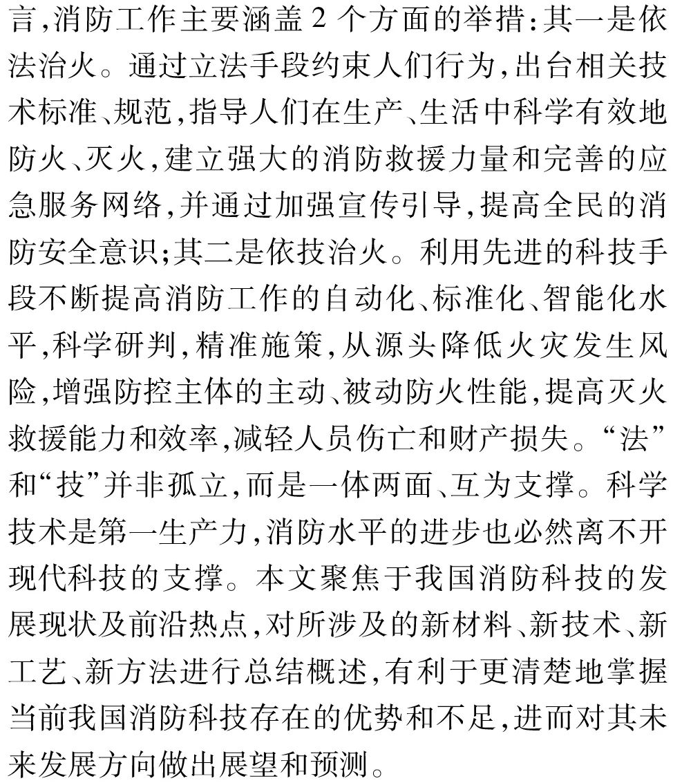 科技是推動消防工作現代化的重要力量。本文從消防科研機構布局、消防科技成就與前沿熱點、消防科技標準化等方面闡述我國消防科技發展現狀,并提出我國消防科技當前存在的不足。在此基礎上,對我國消防科技未來發展方向進行展望,提出定制消防、智慧消防和綠色消防的理念和發展思路。