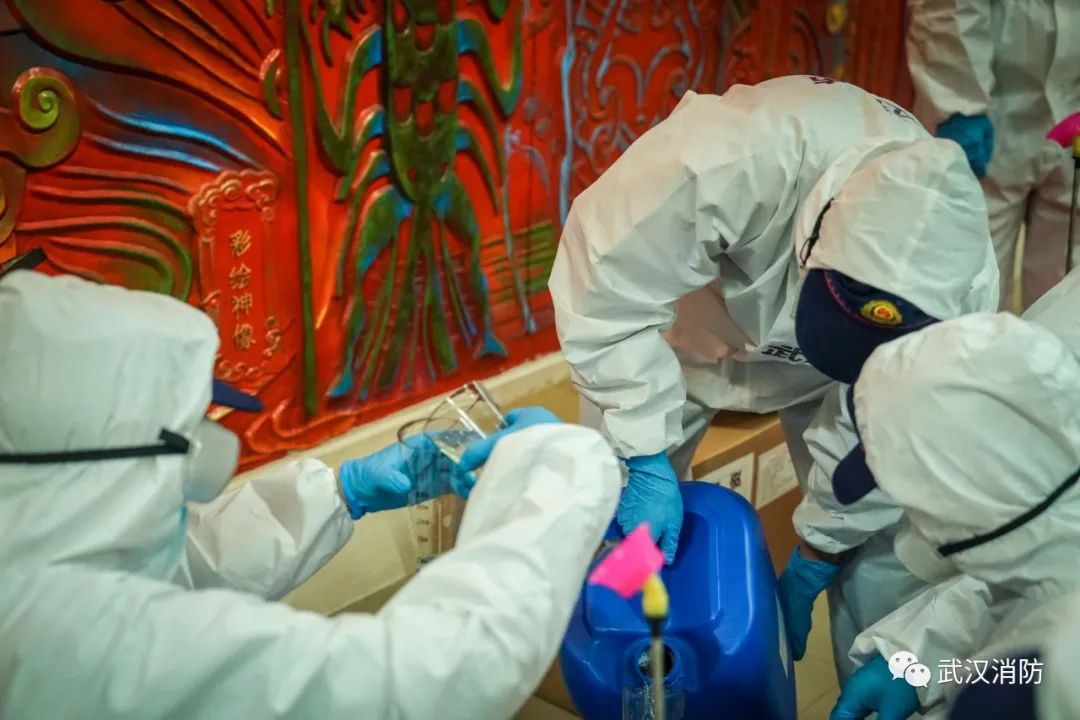 消防員們按照疾控中心工作人員的要求,對消毒藥劑進行合理配比