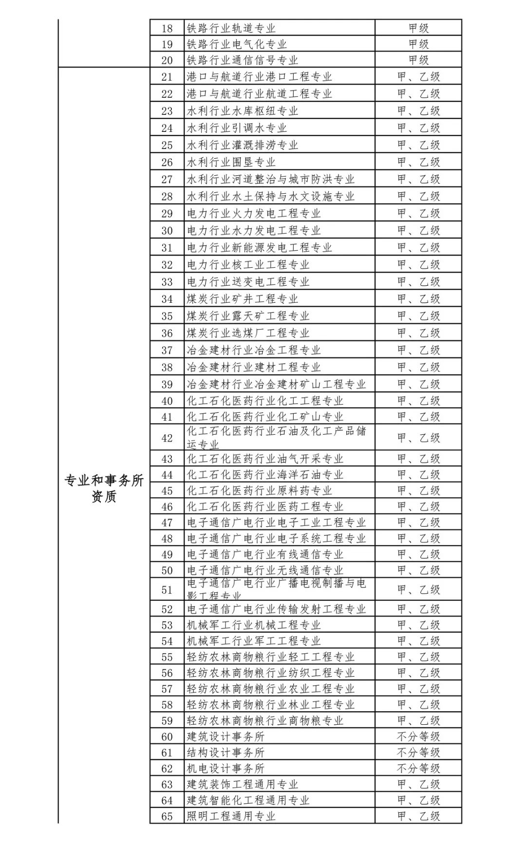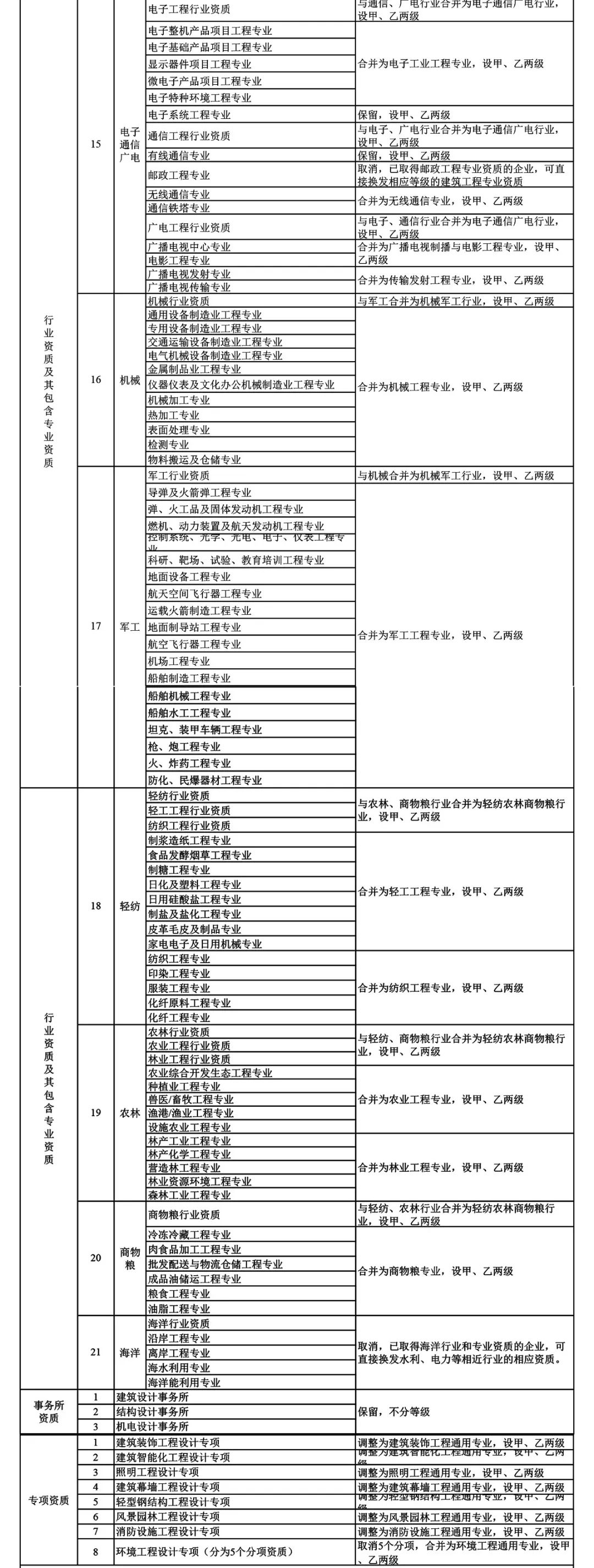 2.工程設(shè)計資質(zhì)。保留綜合資質(zhì);將21類行業(yè)資質(zhì)整合為14類行業(yè)資質(zhì);將151類專業(yè)資質(zhì)、8類專項資質(zhì)、3類事務(wù)所資質(zhì)整合為70類專業(yè)和事務(wù)所資質(zhì)。綜合資質(zhì)、事務(wù)所資質(zhì)不分等級;行業(yè)資質(zhì)、專業(yè)資質(zhì)等級原則上壓減為甲、乙兩級(部分資質(zhì)只設(shè)甲級)。