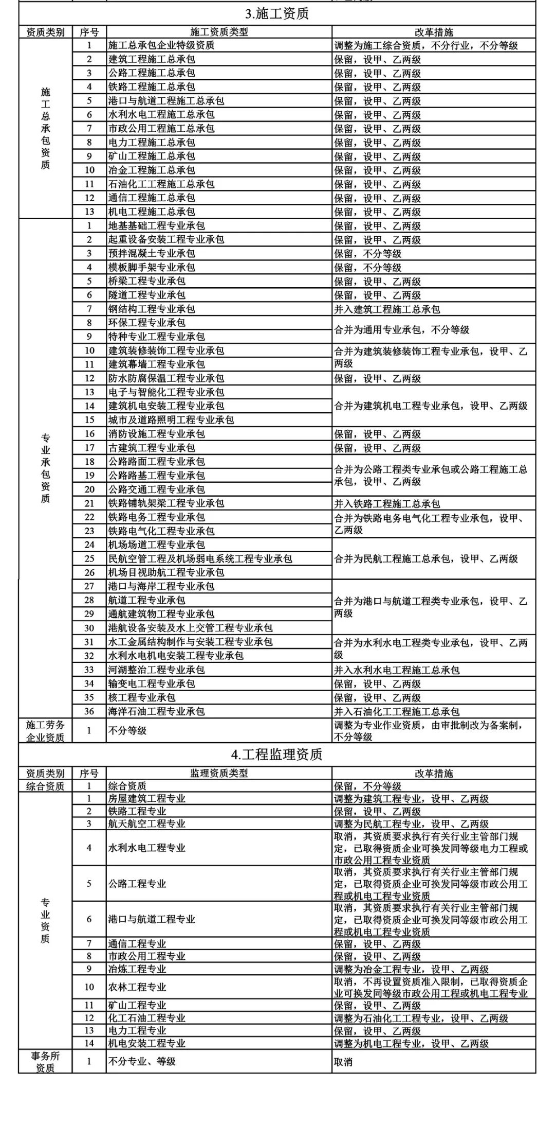 4.工程監(jiān)理資質(zhì)。保留綜合資質(zhì);取消專業(yè)資質(zhì)中的水利水電工程、公路工程、港口與航道工程、農(nóng)林工程資質(zhì),保留其余10類專業(yè)資質(zhì);取消事務(wù)所資質(zhì)。綜合資質(zhì)不分等級,專業(yè)資質(zhì)等級壓減為甲、乙兩級。
