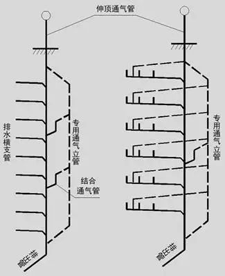 當(dāng)建筑物層數(shù)和衛(wèi)生器具較多時(shí),因排水量大,空氣流動(dòng)過(guò)程宜受排水過(guò)程干擾,須將排水管和通氣管分開(kāi),設(shè)專用通氣管道。