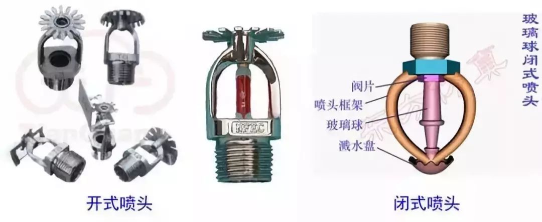 閉式(噴頭噴口由熱敏元件組成,達(dá)到一定溫度后自動(dòng)開(kāi)啟,如玻璃球爆炸、易熔合金脫離。)