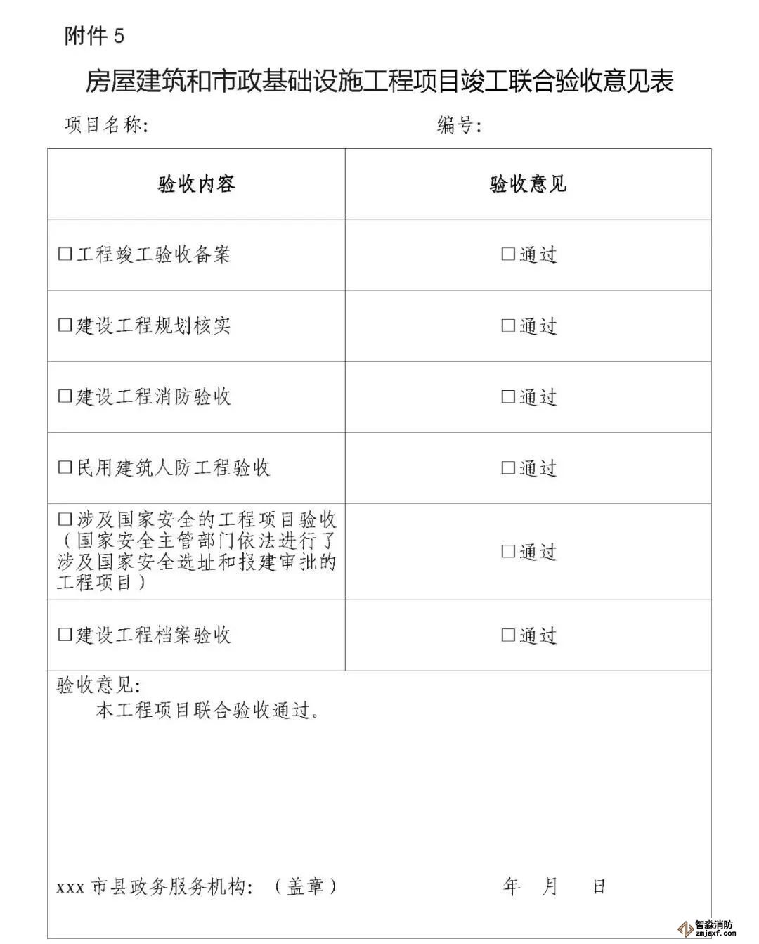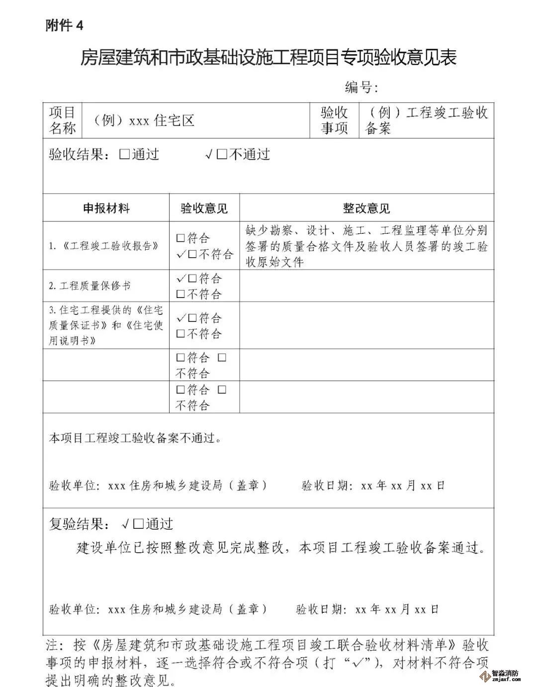 第十三條 各驗收主管部門要按照工程項目驗收情況,填寫《房屋建筑和市政基礎設施工程項目專項驗收意見表》(以下簡稱《專項驗收意見表》,見附件4),出具專項驗收通過或不通過需要整改的意見,并送至綜合窗口;對專項驗收不通過的工程項目,由綜合窗口統(tǒng)一匯總,一次性將整改意見反饋建設單位,整改時間不計入聯(lián)合驗收時間。