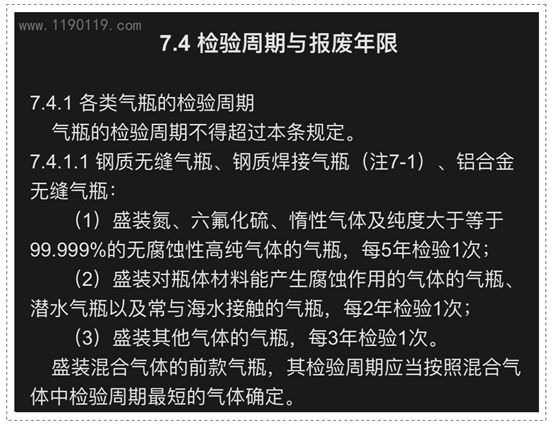 1、參照《氣瓶安全技術監察規程》規定,氣瓶的檢驗周期不得超過以下規定: