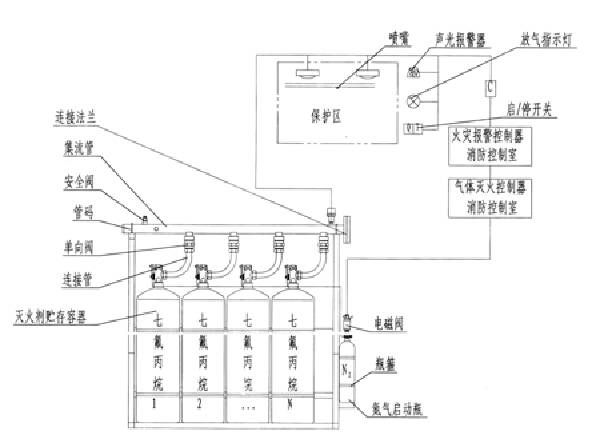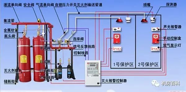 系統(tǒng)主要組件有:儲(chǔ)氣鋼瓶、容器閥、單向閥、選擇閥、驅(qū)動(dòng)裝置、集流管、金屬軟管、噴嘴、壓力反饋裝置、控制盤、系統(tǒng)的管路附件、滅火劑輸送管路附件和儲(chǔ)氣瓶支架等