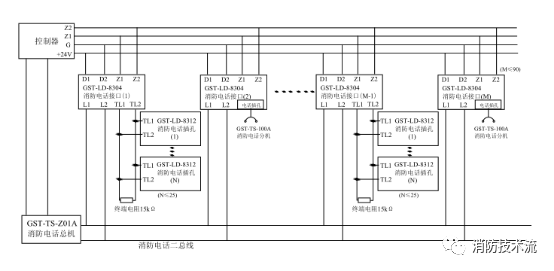 布線要求:信號(hào) Z1、Z2 采用阻燃 RVS 雙絞線,截面積≥1.0mm2 ;消防電話線 TL1、TL2 采用阻燃 RVVP 屏蔽線,截面積≥1.0mm2 。
