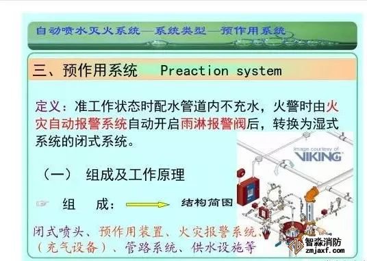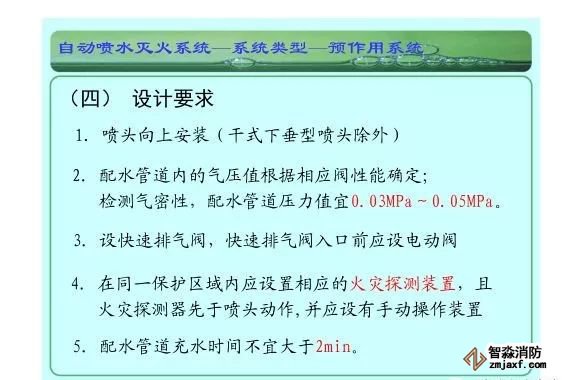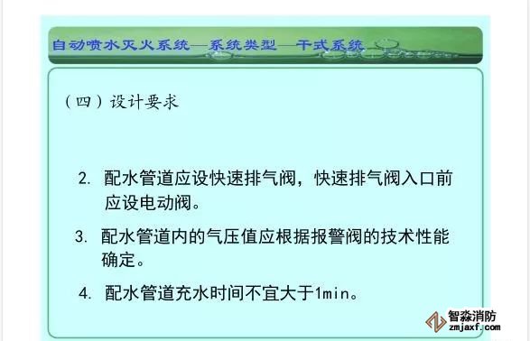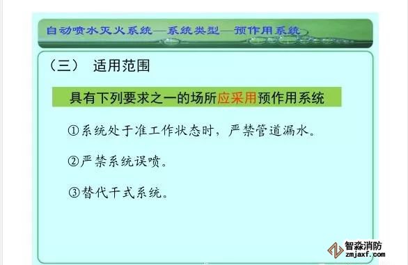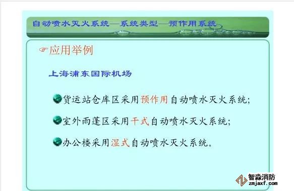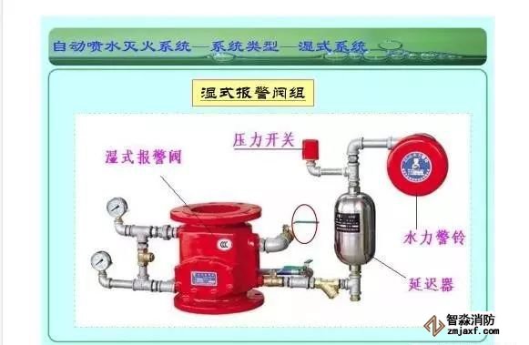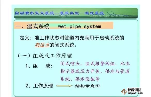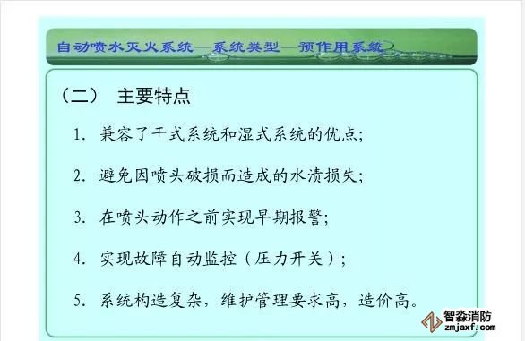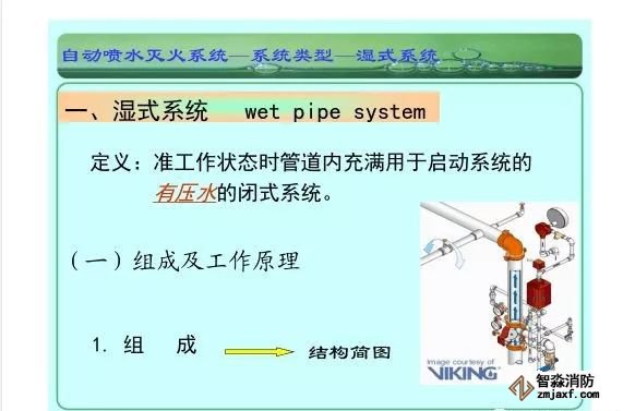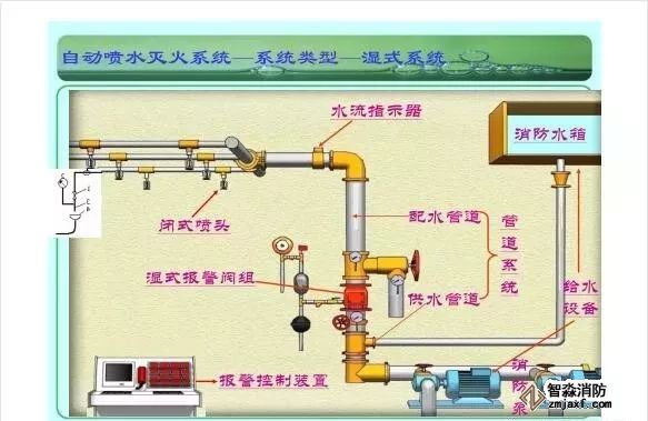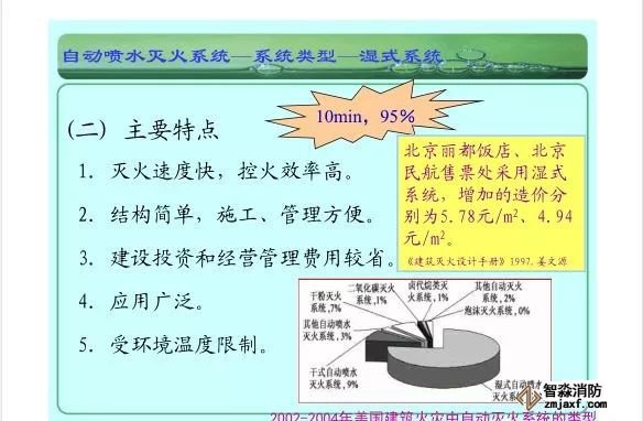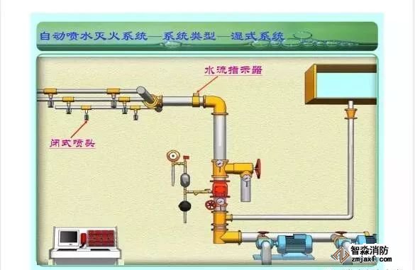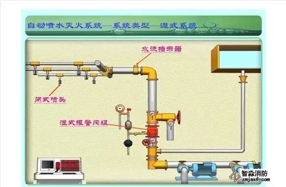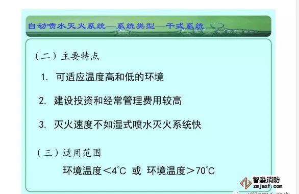 在環境溫度不低于4℃、不高于70℃的建筑物和場所(不能用水撲救的建筑物和場所除外)都可以采用濕式系統。該系統局部應用時,適用于室內較大凈空高度不超過8m、總建筑面積不超過1000㎡的民用建筑中的輕危險級或中危險級Ⅰ級需要局部保護的區域。3.濕式系統特點:①.結構簡單,使用可靠②.系統施工簡單、靈活方便